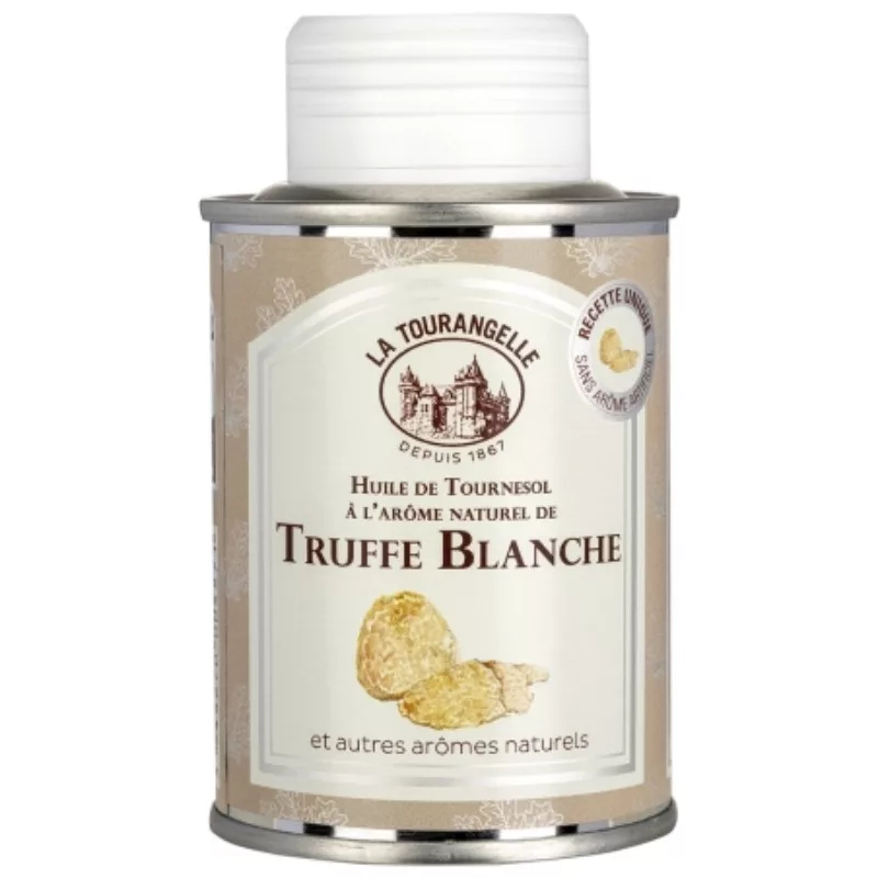 A La Tourangelle Fehér Szarvasgombás Olaj Természetes Aromával 125 ml prémium minőségű, magas olajsavtartalmú napraforgóolaj alapú fűszerolaj, amely Tuber Magnatum (fehér szarvasgomba) természetes aromájával készül. Mesterséges ízesítők nélkül, elegáns, intenzív ízprofillal. Befejező olajként, néhány cseppben használva ad mélységet tésztákhoz, rizottókhoz és tojásos ételekhez. Fényvédő fémdobozos kiszerelésben.