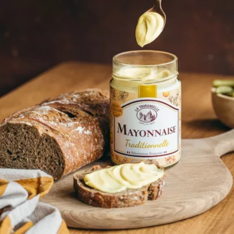 A La Tourangelle Klasszikus Majonéz 270 g francia, szabadtartású tojásból és eredeti dijoni mustárral készült prémium majonéz. Krémes, selymes állagú, kiegyensúlyozott ízű, hozzáadott cukor és tartósítószer nélkül. Saumur városában, a Loire-völgy szívében készül, üvegcsomagolásban.