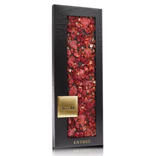 Egy tudatosan felépített ízélmény: ChocoMe Entrée étcsokoládé liofilizált eperrel, málnával és kandírozott rózsaszirommal 110 g