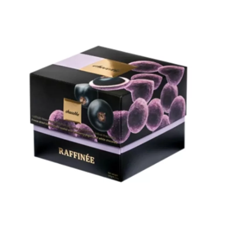 Összetevők: Fehércsokoládé (cukor, kakaóvaj, teljes tejpor, sovány tejpor, emulgeálószer: szójalecitin), liofilizált feketeribizli, liofilizált kékáfonyás joghurt (cukor, sovány tej joghurt, áfonyalé koncentrátum, keményítő, természetes színezék).