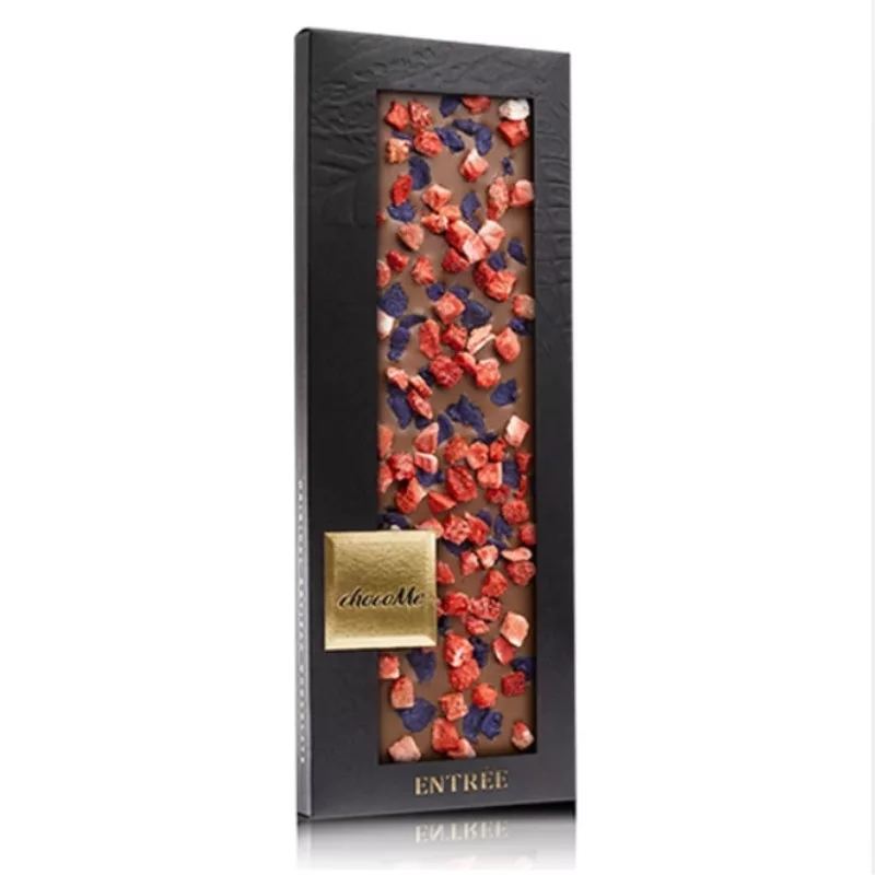 ChocoMe Entrée tejcsokoládé liofilizált eperrel és kandírozott ibolyaszirommal 110 g